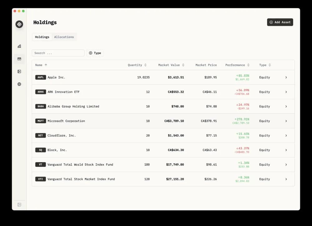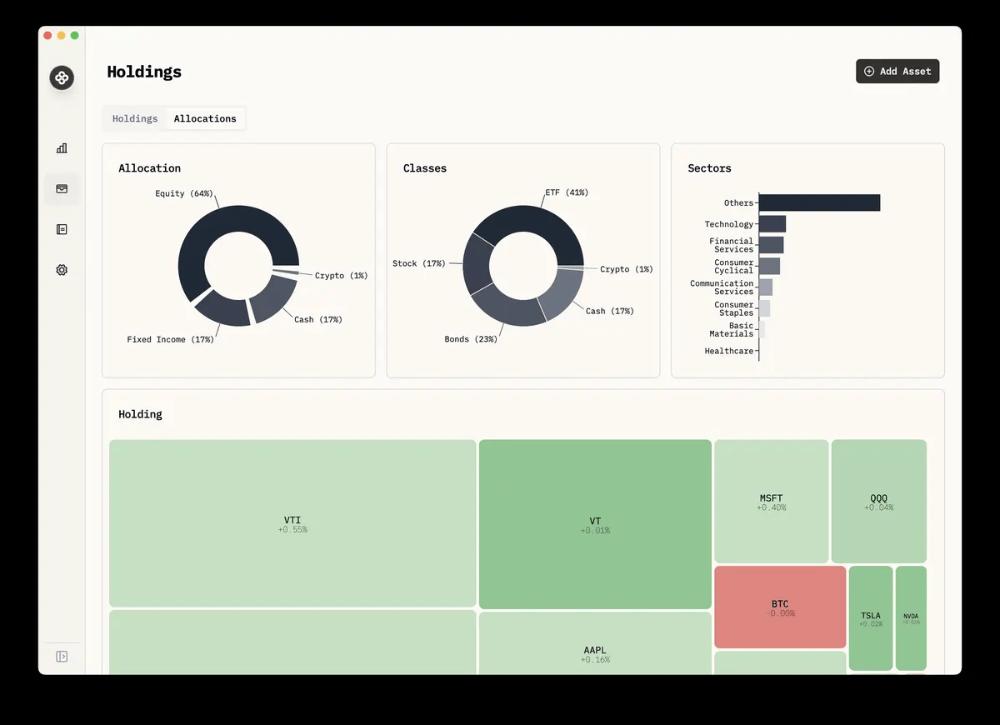 Wealthfolio یه اپلیکیشن دسکتاپ شیک، امن و با تمرکز ویژه روی حفظ حریم خصوصی برای ردیابی سرمایهگذاریهای شماست. با ذخیرهسازی محلی دادهها، میتونید از تحلیلهای جامع پورتفولیو لذت ببرید و خیالتون راحت باشه که هیچ اطلاعاتی از شما به بیرون درز نمیکنه.